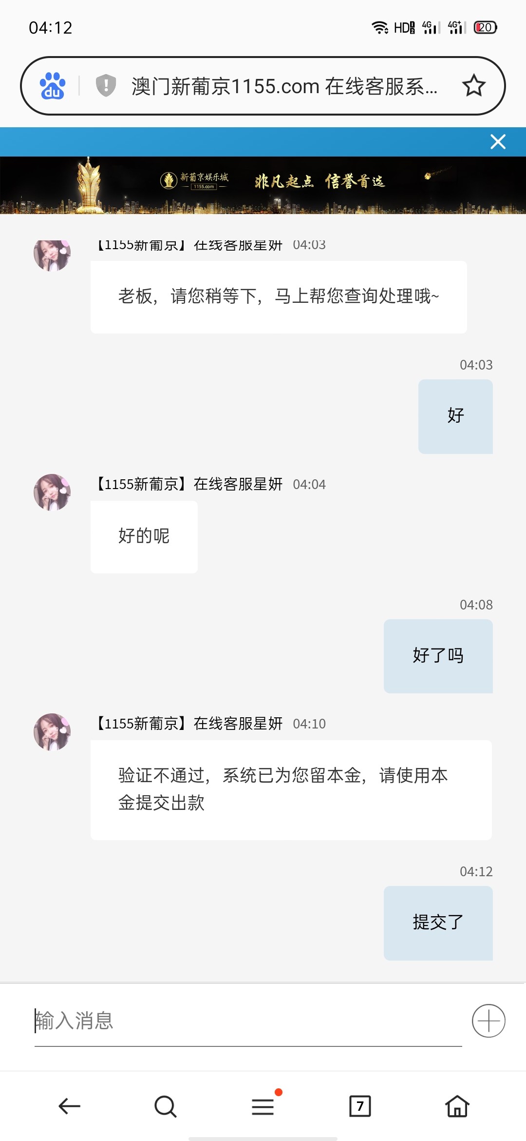 老板,当前取款的会员较多,财务正在按序处理当中,已通知财务尽快处理,耽误您的宝贵时间还请您谅解呢~