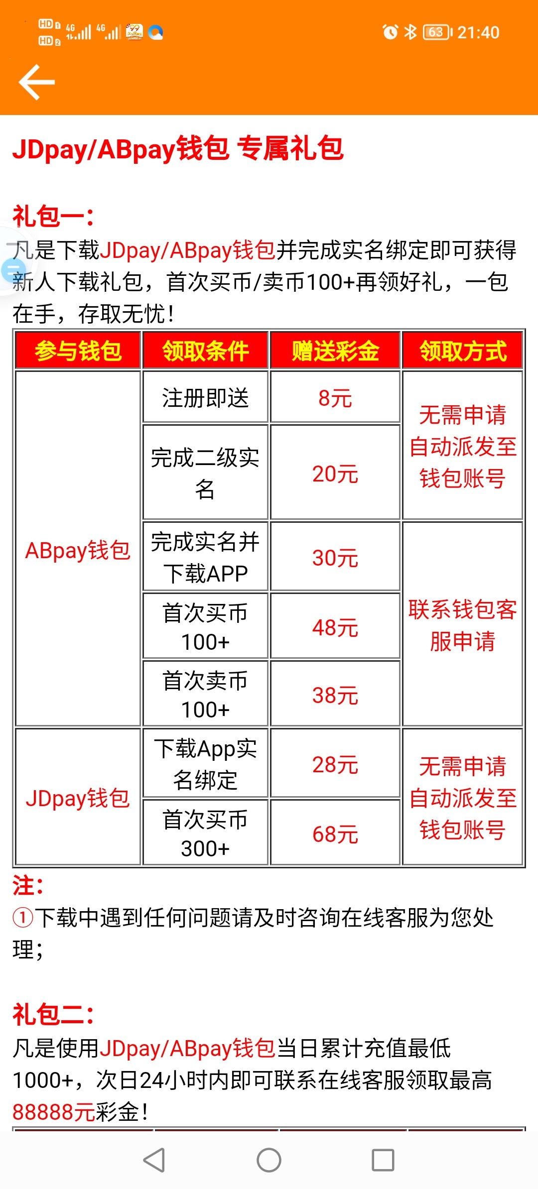 我教你们怎么弄58,要不然注册不了,先注册。然后点击我的,再点击充值点击数据钱包,滑到下面找到AB支付,充100它会自动浏览到那个钱包里面,然后实名认证送28,最后下载app送30一共58,注意最后的下载app送30要有耐心,他说20分钟到账,其实20分钟后不到账的,然后后面一直找他,询问他红包不到账,后面他会给的,我前前后后用了差不多一个小时才送30,一共58可以直接充值,不需要买币第1次提现需要提现银行卡