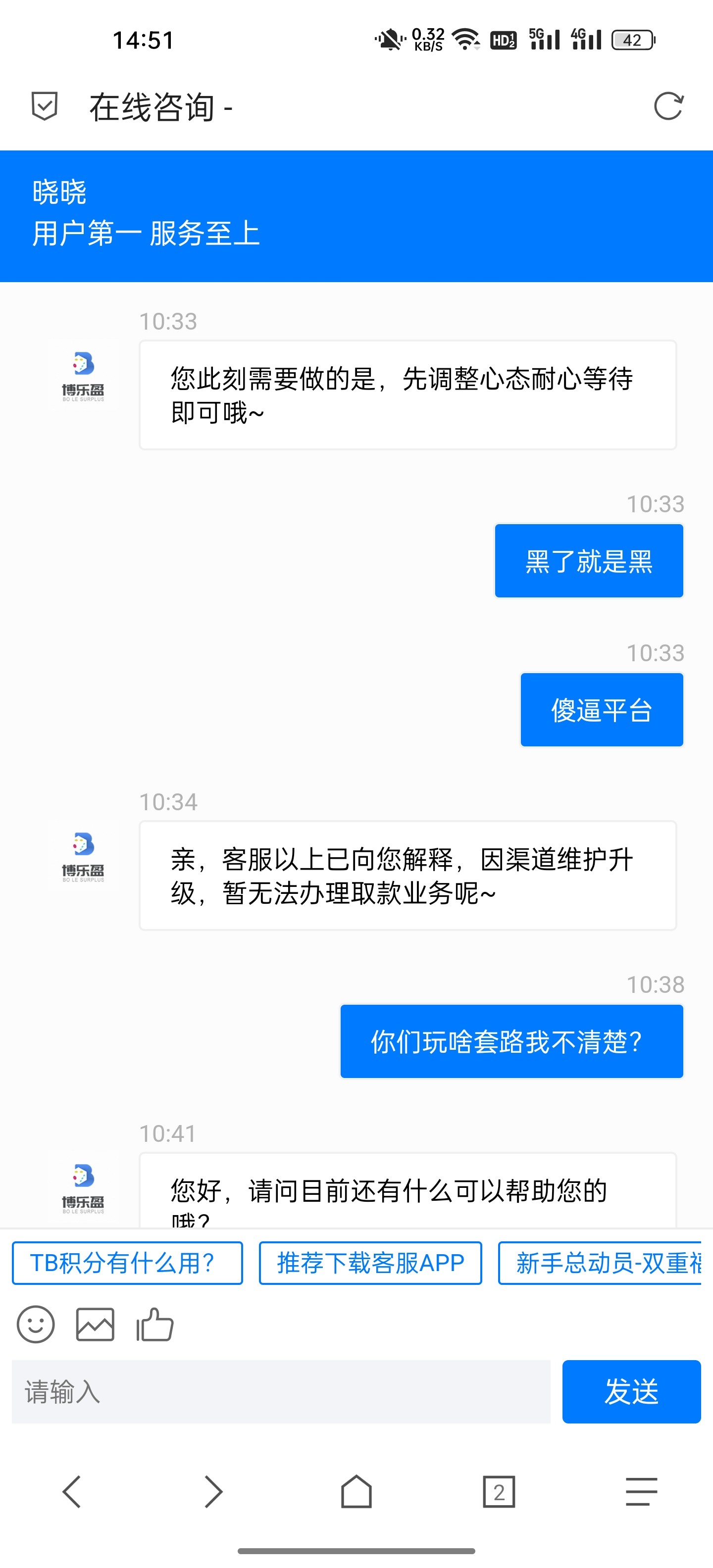 博乐盈黑台,玩了几年的平台还是黑了,哎,还在玩的别玩了现在,现在狗庄都活不起了,一个个都开始黑了,小蓝台都不行了