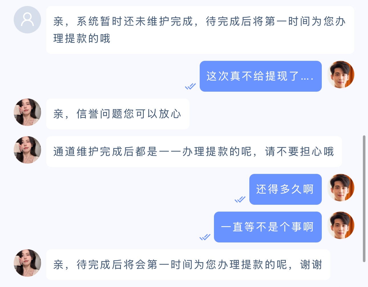 前天白嫖签到送88和首存100+30 还提现成功了1500 现在问客服提款通道在维护咋办啊