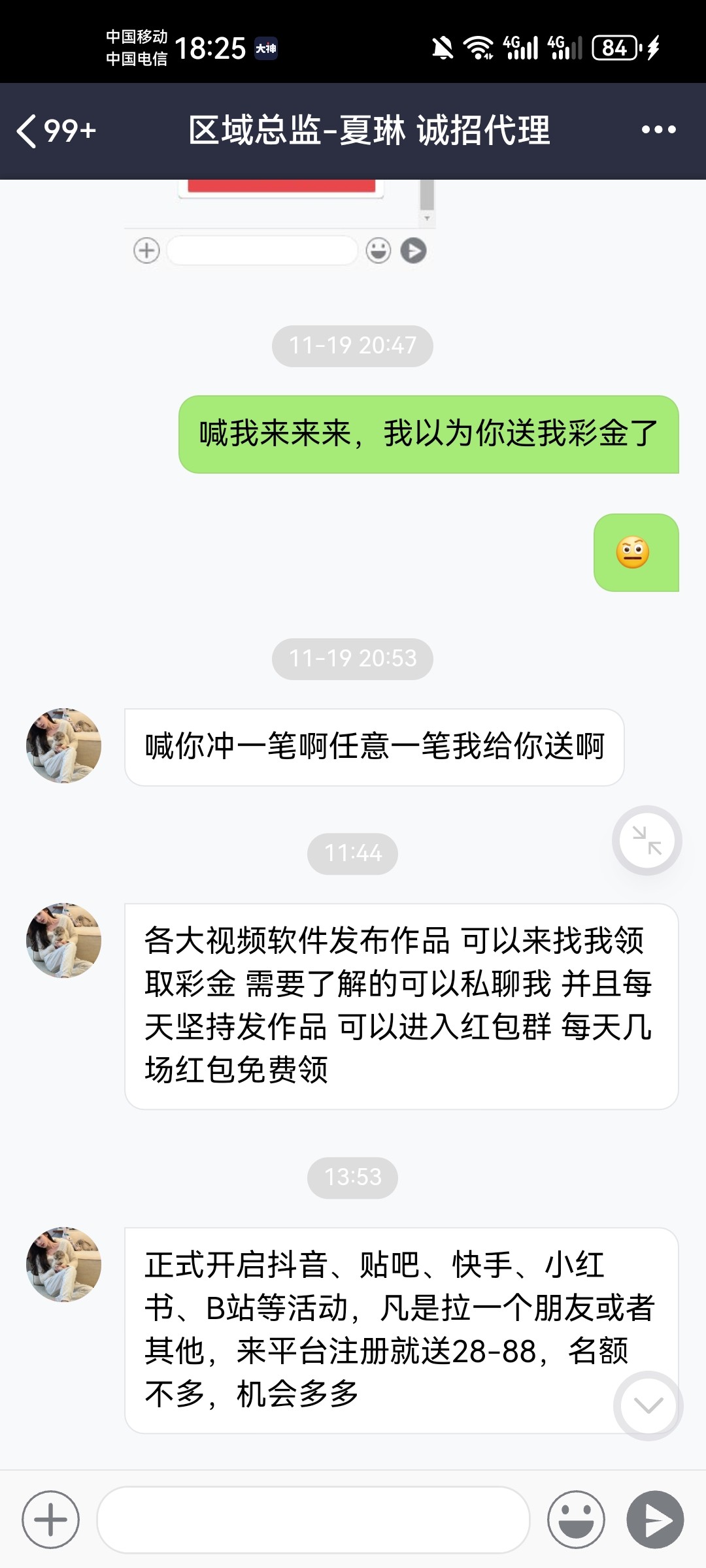 忘记说了,补一下,注册了首页微聊好友进去点右上角加W148654433领取,还能每天抢4个免费红包